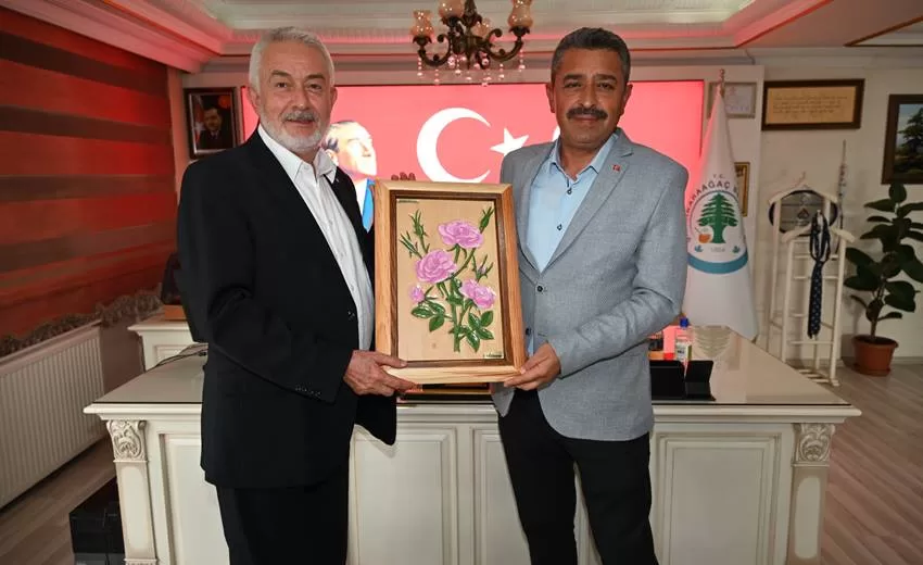 Belediye Başkanı Şükrü Başdeğirmen, Şarkikaraağaç Belediye Başkanı Ali Göçer’e günün anısına gül tablosu hediye etti.